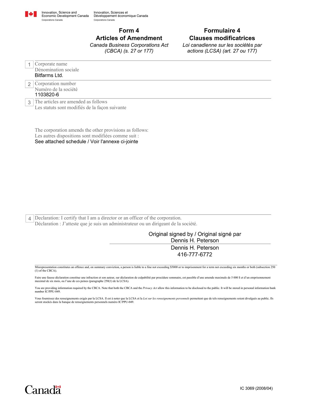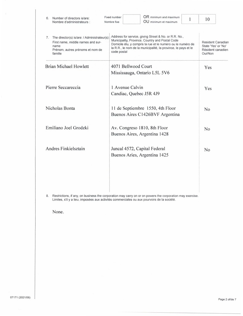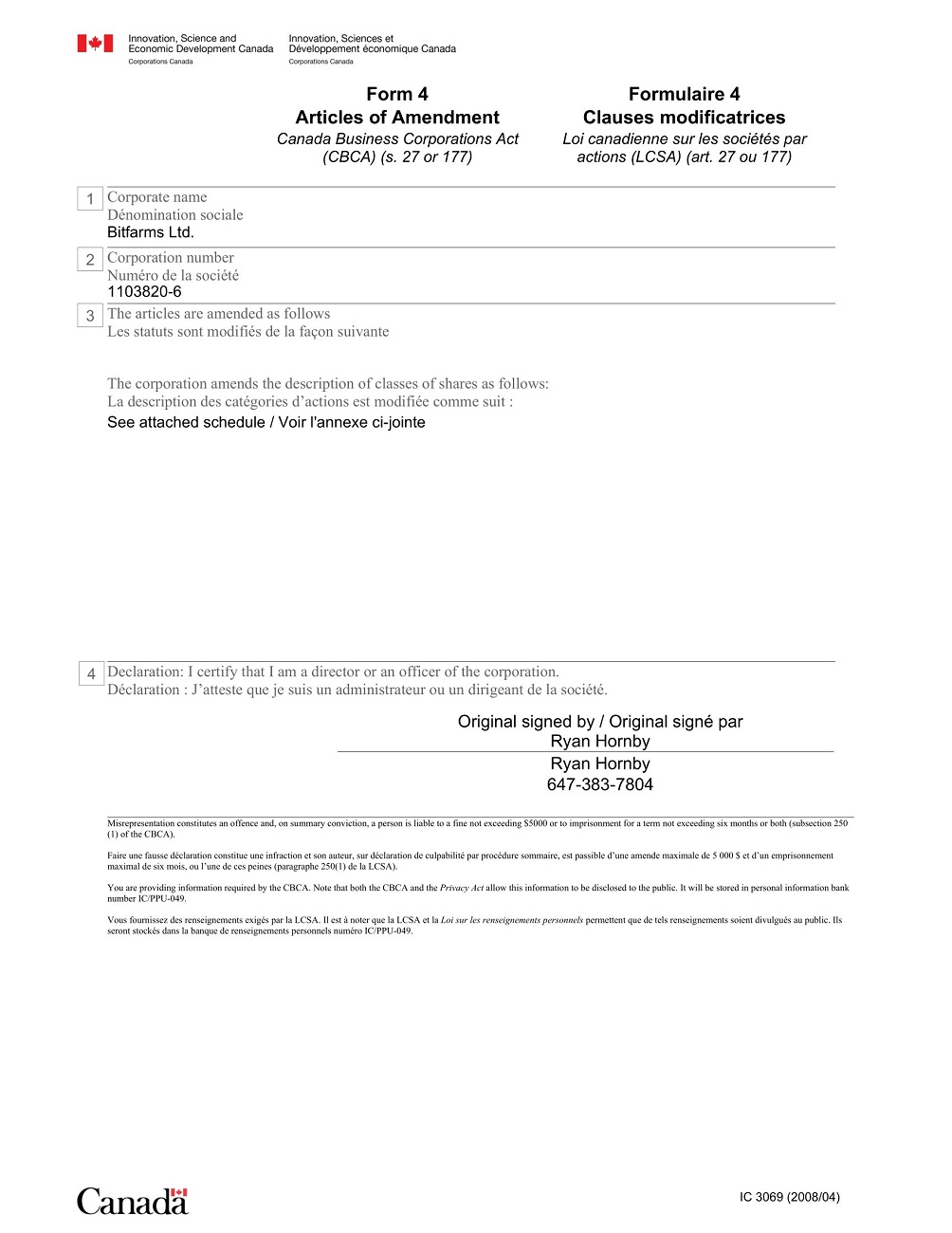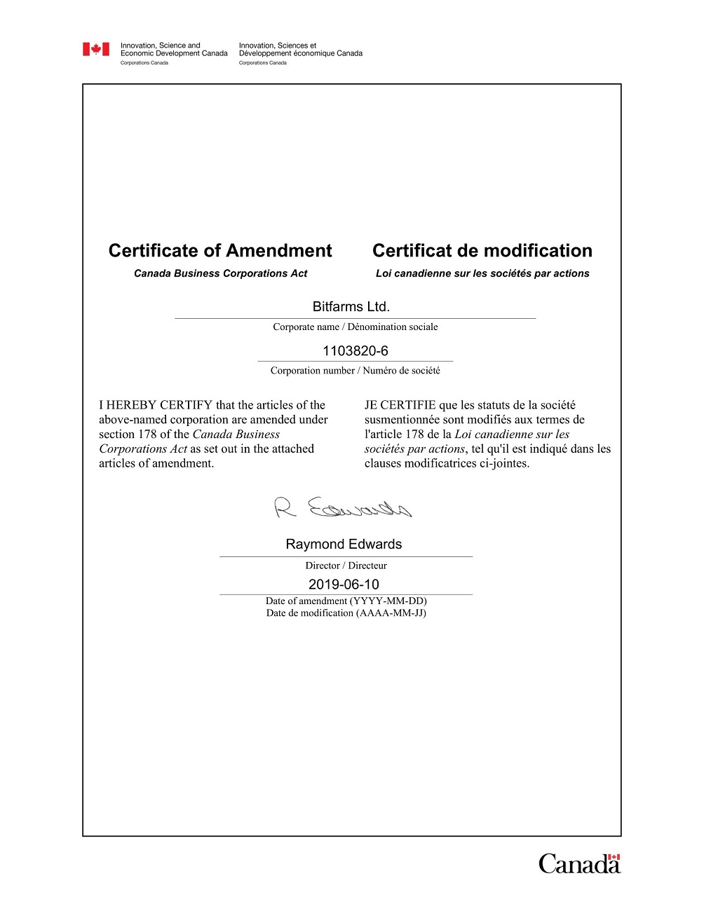 | (c) | a certificate of status dated March 18, 2025 issued by the Director under the OBCA with respect to the Corporation; |