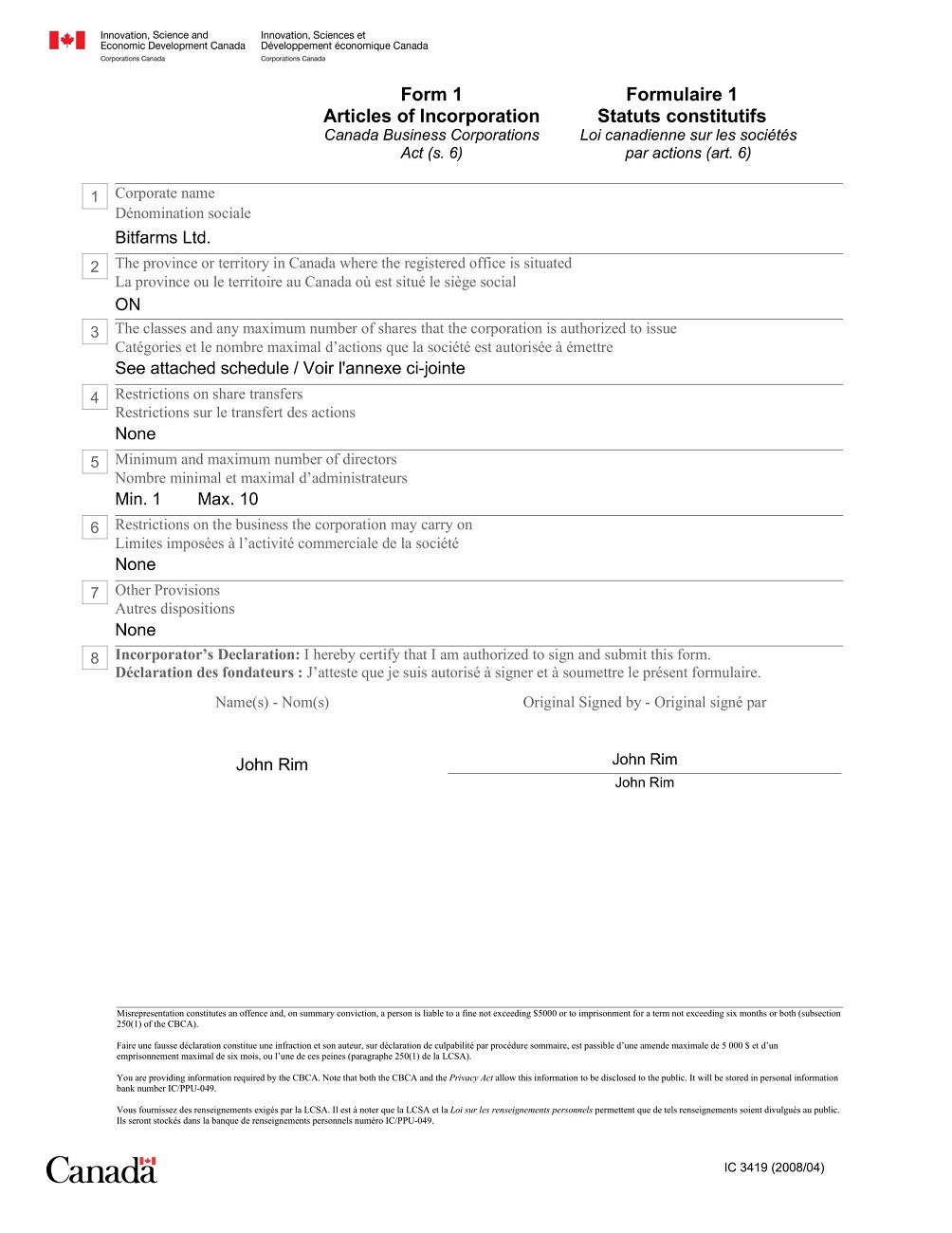 This certifies that ________, or registered assigns, is the registered holder of the number of Rights set forth above, each of which entitles the registered holder thereof, subject to the terms, provisions and conditions of the Shareholder Rights Plan Agreement dated as of July 24, 2024, as the same may be amended or supplemented from time to time (the “Shareholder Rights Agreement”), between Bitfarms Ltd., a corporation continued under the laws of the Province of Ontario (the “Corporation”) and TSX Trust Company, a trust company existing under the laws of Canada (the “Rights Agent”) (which term shall include any successor Rights Agent under the Shareholder Rights Agreement), to purchase from the Corporation at any time after the Separation Time (as such term is defined in the Shareholder Rights Agreement) and prior to the Expiration Time (as such term is defined in the Shareholder Rights Agreement), one fully paid common share of the Corporation (a “Common Share”) at the Exercise Price referred to below, upon presentation and surrender of this Rights Certificate with the Form of Election to Exercise (in the form provided hereinafter) duly executed and submitted to the Rights Agent, together with payment of the Exercise Price by certified cheque, bank draft or money order payable to the Corporation, at the Rights Agent’s principal office in any of the city of Toronto. Until adjustment thereof in certain events as provided in the Shareholder Rights Agreement, the Exercise Price shall be: