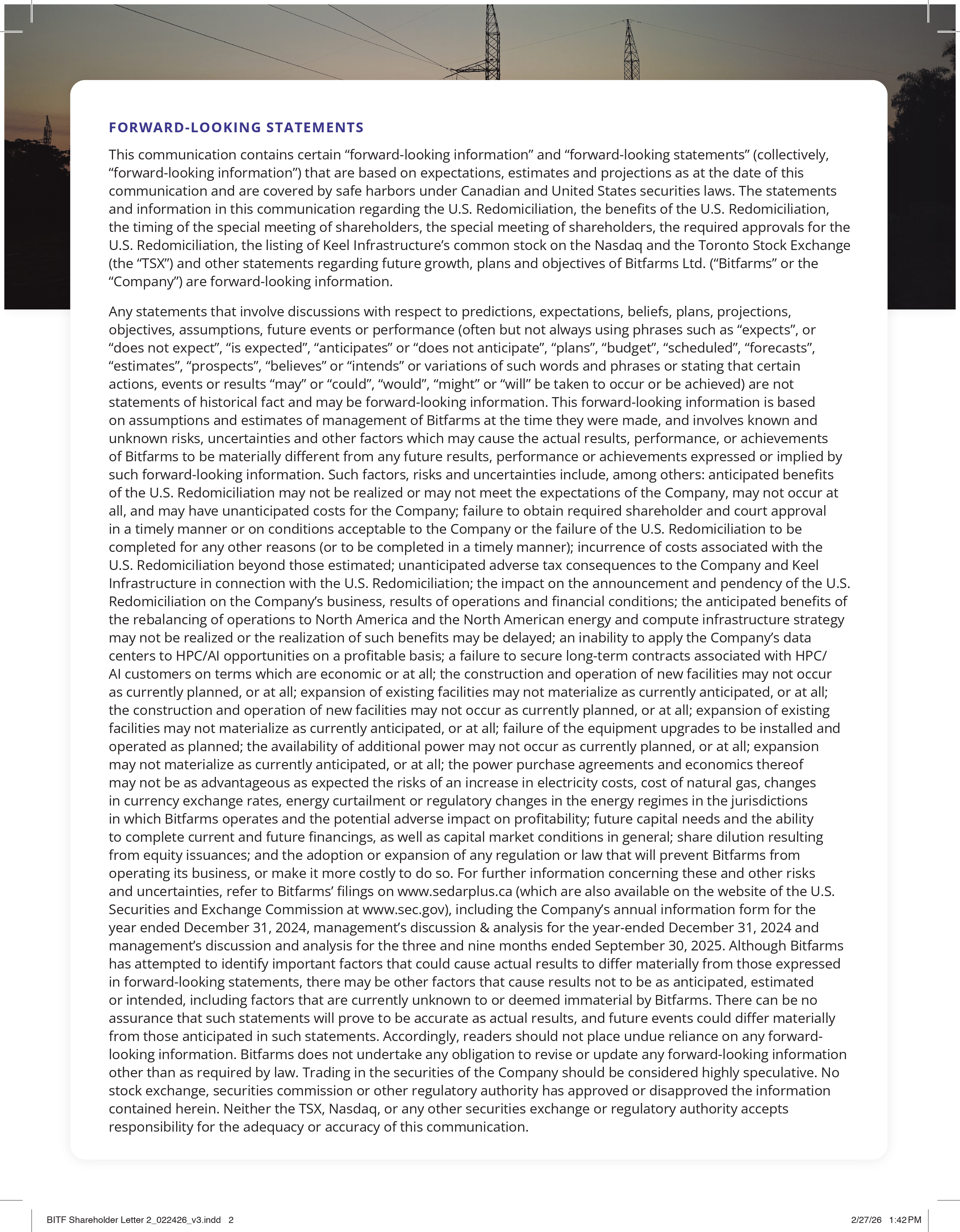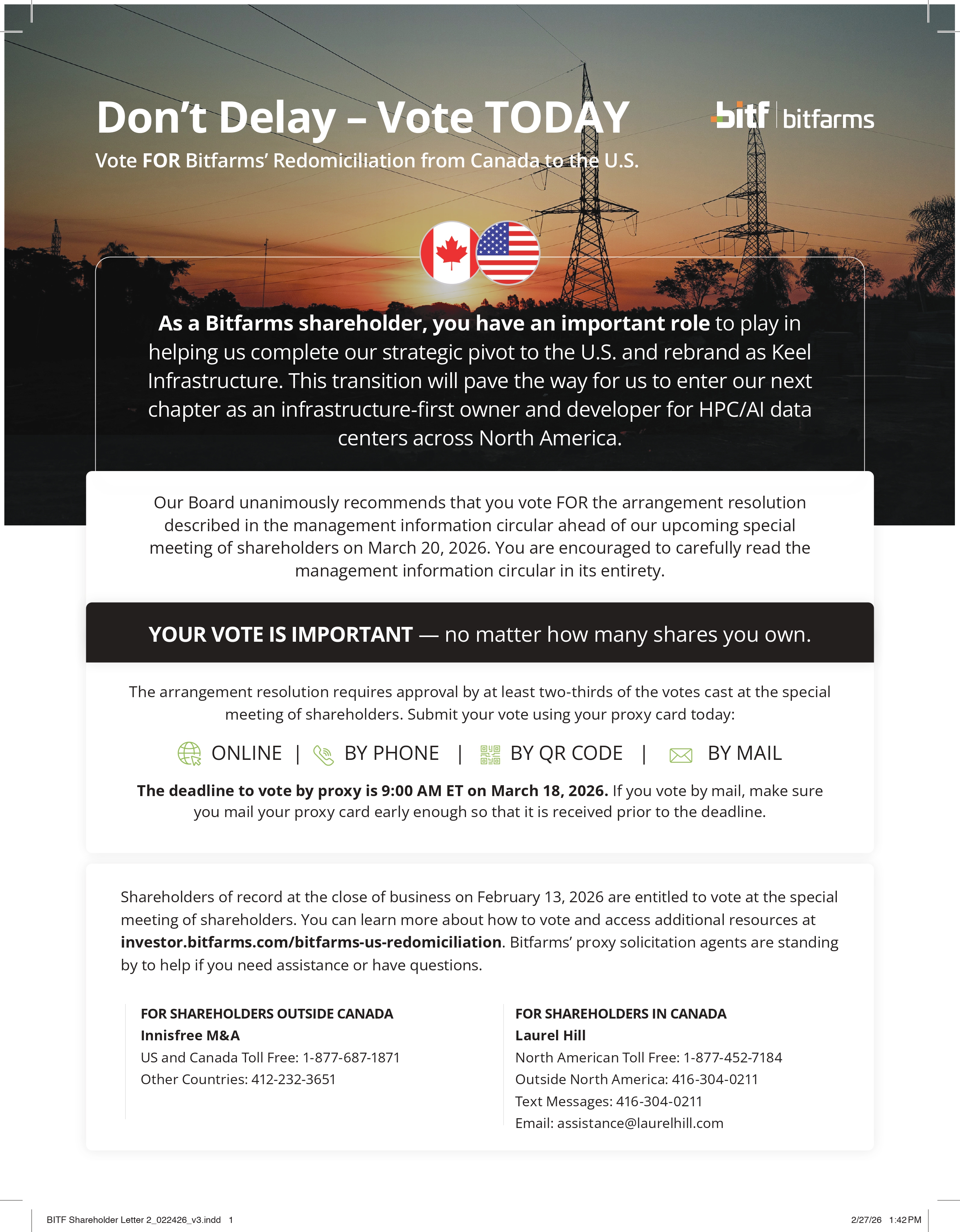As a Bitfarms shareholder, you have an important role to play in helping us complete our strategic pivot to the U.S. and rebrand as Keel Infrastructure. This transition will pave the way for us to enter our next chapter as an infrastructure - first owner and developer for HPC/AI data centers across North America. Vote FOR Bitfarms’ Redomiciliation from Canada to the U.S. YOUR VOTE IS IMPORTANT — no matter how many shares you own. Don’t Delay – Vote TODAY Shareholders of record at the close of business on February 13, 2026 are entitled to vote at the special meeting of shareholders. You can learn more about how to vote and access additional resources at investor.bitfarms.com/bitfarms - us - redomiciliation . Bitfarms’ proxy solicitation agents are standing by to help if you need assistance or have questions. The arrangement resolution requires approval by at least two - thirds of the votes cast at the special meeting of shareholders. Submit your vote using your proxy card today: ONLINE | BY PHONE | BY QR CODE | BY MAIL The deadline to vote by proxy is 9:00 AM ET on March 18, 2026. If you vote by mail, make sure you mail your proxy card early enough so that it is received prior to the deadline. FOR SHAREHOLDERS OUTSIDE CANADA Innisfree M&A US and Canada Toll Free: 1 - 877 - 687 - 1871 Other Countries: 412 - 232 - 3651 FOR SHAREHOLDERS IN CANADA Laurel Hill North American Toll Free: 1 - 877 - 452 - 7184 Outside North America: 416 - 304 - 0211 Text Messages: 416 - 304 - 0211 Email: assistance@laurelhill.com Our Board unanimously recommends that you vote FOR the arrangement resolution described in the management information circular ahead of our upcoming special meeting of shareholders on March 20, 2026. You are encouraged to carefully read the management information circular in its entirety. BITF Shareholder Letter 2_022426_v3.indd 1 BITF Shareholder Letter 2_022426_v3.indd 1 2/27/26 1:42 PM 2/27/26 1:42 PM