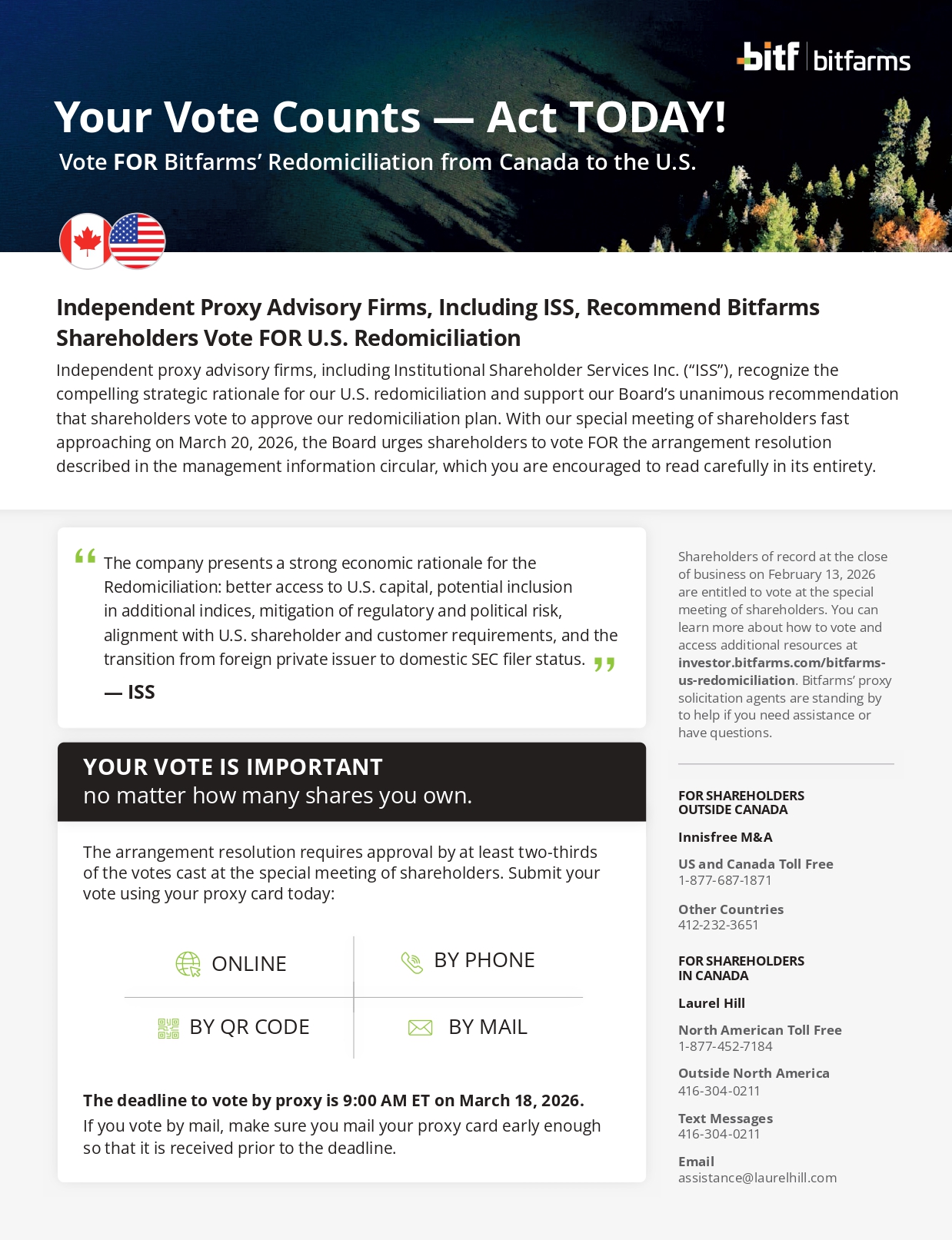 Your Vote Counts — Act TODAY! Vote FOR Bitfarms’ Redomiciliation from Canada to the U.S. YOUR VOTE IS IMPORTANT no matter how many shares you own. Shareholders of record at the close of business on February 13, 2026 are entitled to vote at the special meeting of shareholders. You can learn more about how to vote and access additional resources at investor.bitfarms.com/bitfarms - us - redomiciliation . Bitfarms’ proxy solicitation agents are standing by to help if you need assistance or have questions. The arrangement resolution requires approval by at least two - thirds of the votes cast at the special meeting of shareholders . Submit your vote using your proxy card today : The company presents a strong economic rationale for the Redomiciliation: better access to U.S. capital, potential inclusion in additional indices, mitigation of regulatory and political risk, alignment with U.S. shareholder and customer requirements, and the transition from foreign private issuer to domestic SEC filer status. — ISS FOR SHAREHOLDERS IN CANADA Laurel Hill North American Toll Free 1 - 877 - 452 - 7184 Outside North America 416 - 304 - 0211 Text Messages 416 - 304 - 0211 Email assistance@laurelhill.com The deadline to vote by proxy is 9:00 AM ET on March 18, 2026. If you vote by mail, make sure you mail your proxy card early enough so that it is received prior to the deadline. BY PHONE ONLINE BY QR CODE BY MAIL Independent Proxy Advisory Firms, Including ISS, Recommend Bitfarms Shareholders Vote FOR U.S. Redomiciliation Independent proxy advisory firms, including Institutional Shareholder Services Inc. (“ISS”), recognize the compelling strategic rationale for our U.S. redomiciliation and support our Board’s unanimous recommendation that shareholders vote to approve our redomiciliation plan. With our special meeting of shareholders fast approaching on March 20, 2026, the Board urges shareholders to vote FOR the arrangement resolution described in the management information circular, which you are encouraged to read carefully in its entirety. FOR SHAREHOLDERS OUTSIDE CANADA Innisfree M&A US and Canada Toll Free 1 - 877 - 687 - 1871 Other Countries 412 - 232 - 3651