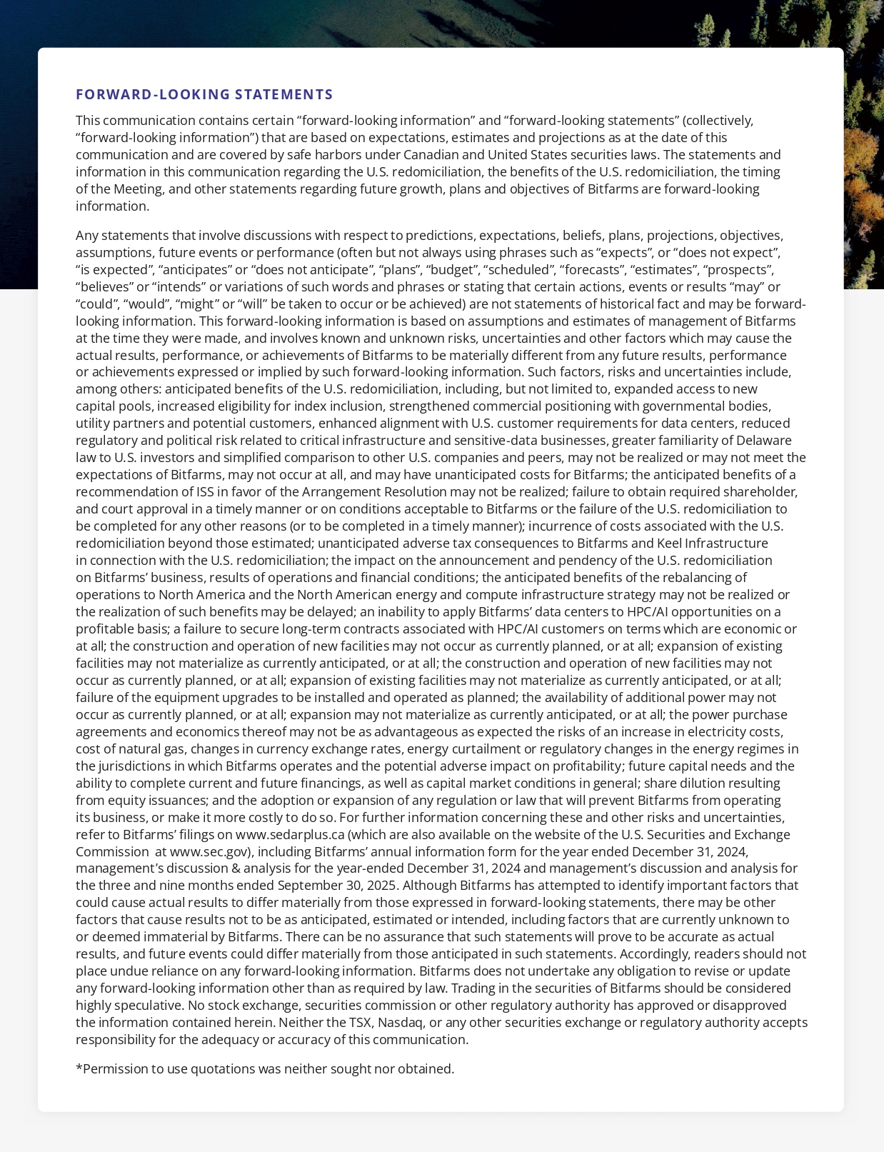 FORWARD - LOOKING STATEMENTS This communication contains certain “forward - looking information” and “forward - looking statements” (collectively, “forward - looking information”) that are based on expectations, estimates and projections as at the date of this communication and are covered by safe harbors under Canadian and United States securities laws. The statements and information in this communication regarding the U.S. redomiciliation, the benefits of the U.S. redomiciliation, the timing of the Meeting, and other statements regarding future growth, plans and objectives of Bitfarms are forward - looking information. Any statements that involve discussions with respect to predictions, expectations, beliefs, plans, projections, objectives, assumptions, future events or performance (often but not always using phrases such as “expects”, or “does not expect”, “is expected”, “anticipates” or “does not anticipate”, “plans”, “budget”, “scheduled”, “forecasts”, “estimates”, “prospects”, “believes” or “intends” or variations of such words and phrases or stating that certain actions, events or results “may” or “could”, “would”, “might” or “will” be taken to occur or be achieved) are not statements of historical fact and may be forward - looking information. This forward - looking information is based on assumptions and estimates of management of Bitfarms at the time they were made, and involves known and unknown risks, uncertainties and other factors which may cause the actual results, performance, or achievements of Bitfarms to be materially different from any future results, performance or achievements expressed or implied by such forward - looking information. Such factors, risks and uncertainties include, among others: anticipated benefits of the U.S. redomiciliation, including, but not limited to, expanded access to new capital pools, increased eligibility for index inclusion, strengthened commercial positioning with governmental bodies, utility partners and potential customers, enhanced alignment with U.S. customer requirements for data centers, reduced regulatory and political risk related to critical infrastructure and sensitive - data businesses, greater familiarity of Delaware law to U.S. investors and simplified comparison to other U.S. companies and peers, may not be realized or may not meet the expectations of Bitfarms, may not occur at all, and may have unanticipated costs for Bitfarms; the anticipated benefits of a recommendation of ISS in favor of the Arrangement Resolution may not be realized; failure to obtain required shareholder, and court approval in a timely manner or on conditions acceptable to Bitfarms or the failure of the U.S. redomiciliation to be completed for any other reasons (or to be completed in a timely manner); incurrence of costs associated with the U.S. redomiciliation beyond those estimated; unanticipated adverse tax consequences to Bitfarms and Keel Infrastructure in connection with the U.S. redomiciliation; the impact on the announcement and pendency of the U.S. redomiciliation on Bitfarms’ business, results of operations and financial conditions; the anticipated benefits of the rebalancing of operations to North America and the North American energy and compute infrastructure strategy may not be realized or the realization of such benefits may be delayed; an inability to apply Bitfarms’ data centers to HPC/AI opportunities on a profitable basis;a failure to secure long - term contracts associated with HPC/AI customers on terms which are economic or at all; the construction and operation of new facilities may not occur as currently planned, or at all; expansion of existing facilities may not materialize as currently anticipated, or at all; the construction and operation of new facilities may not occur as currently planned, or at all; expansion of existing facilities may not materialize as currently anticipated, or at all; failure of the equipment upgrades to be installed and operated as planned; the availability of additional power may not occur as currently planned, or at all; expansion may not materialize as currently anticipated, or at all; the power purchase agreements and economics thereof may not be as advantageous as expected the risks of an increase in electricity costs, cost of natural gas, changes in currency exchange rates, energy curtailment or regulatory changes in the energy regimes in the jurisdictions in which Bitfarms operates and the potential adverse impact on profitability; future capital needs and the ability to complete current and future financings, as well as capital market conditions in general; share dilution resulting from equity issuances; and the adoption or expansion of any regulation or law that will prevent Bitfarms from operating its business, or make it more costly to do so. For further information concerning these and other risks and uncertainties, refer to Bitfarms’ filings on www.sedarplus.ca (which are also available on the website of the U.S. Securities and Exchange Commission at www.sec.gov), including Bitfarms’ annual information form for the year ended December 31, 2024, management’s discussion & analysis for the year - ended December 31, 2024 and management’s discussion and analysis for the three and nine months ended September 30, 2025. Although Bitfarms has attempted to identify important factors that could cause actual results to differ materially from those expressed in forward - looking statements, there may be other factors that cause results not to be as anticipated, estimated or intended, including factors that are currently unknown to or deemed immaterial by Bitfarms. There can be no assurance that such statements will prove to be accurate as actual results, and future events could differ materially from those anticipated in such statements. Accordingly, readers should not place undue reliance on any forward 