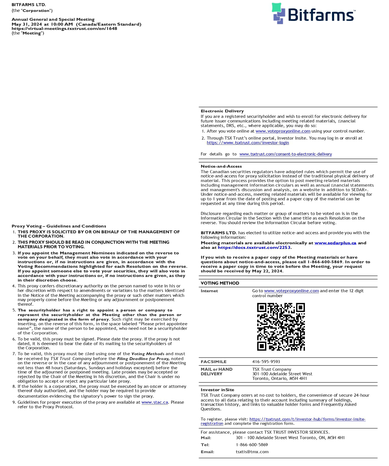 Meeting materials including the Circular and the Corporation’s consolidated financial statements for the years ended December 31, 2023 and 2022 and the Corporation’s management discussion and analysis for the year ended December 31, 2023 and the year ended December 31, 2022 are available on the Corporation’s website at https://investor.bitfarms.com/financial-information, on the Corporation’s SEDAR+ profile at www.sedarplus.ca, on the U.S. Securities and Exchange Commission’s EDGAR website at www.sec.gov/EDGAR and on the website of the Corporation’s registrar and transfer agent at https://docs.tsxtrust.com/2253. For more information regarding the Corporation, please also refer to the Annual Information Form, available on the Corporation’s SEDAR+ profile and on EDGAR.