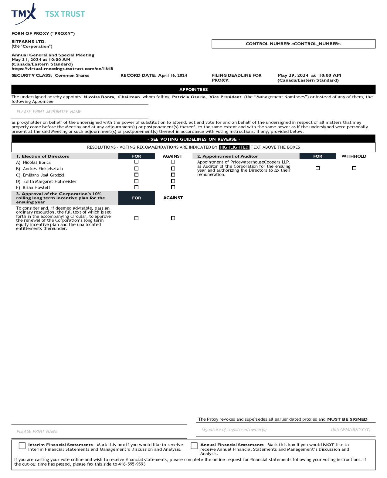 If you are a non-registered shareholder and want to vote online at the Meeting, you must appoint yourself as proxyholder and register with TSX Trust in advance of the Meeting by emailing tsxtrustproxyvoting@tmx.com the “Request for Control Number” form, which can be found here https://tsxtrust.com/resource/en/75.