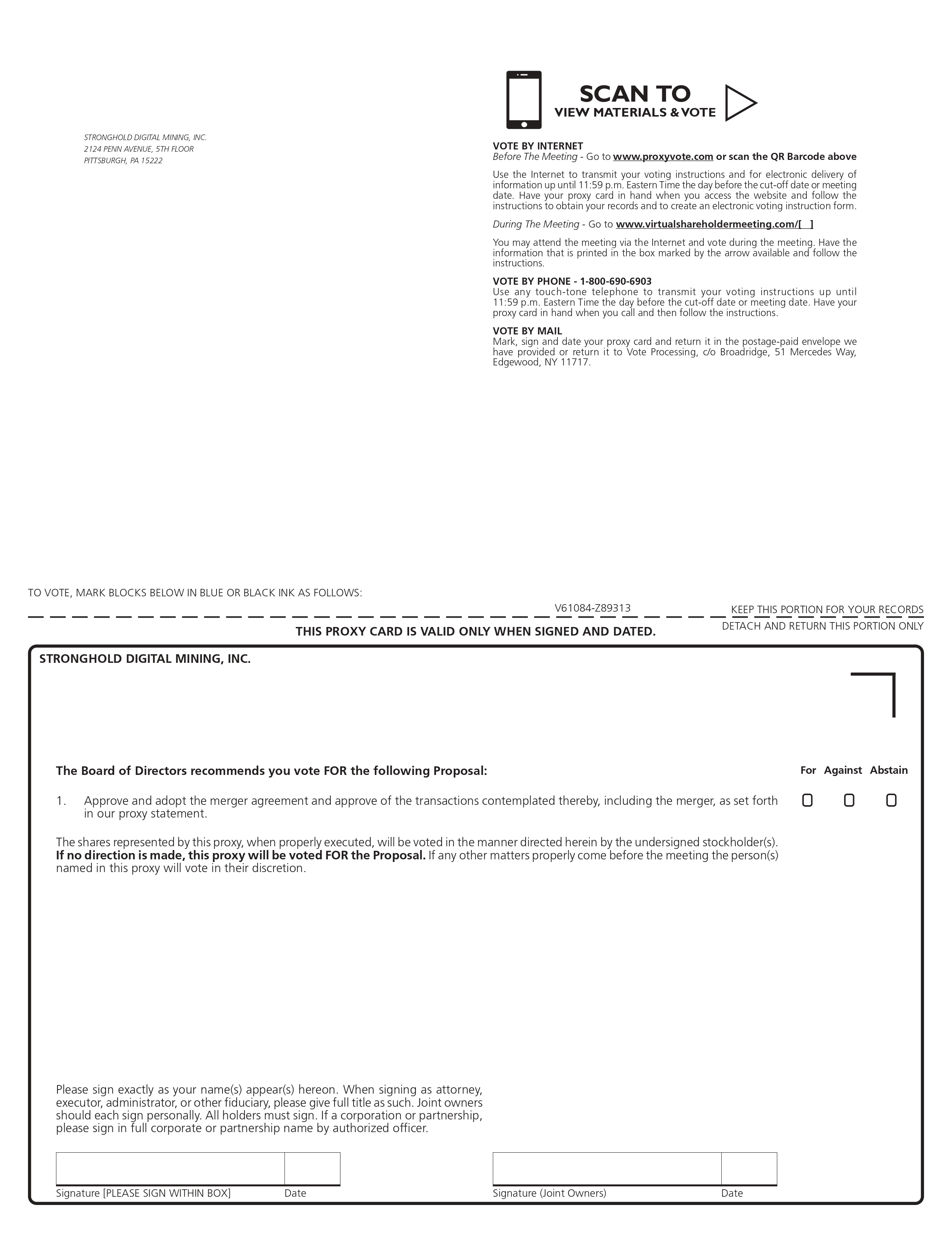 Signature [PLEASE SIGN WITHIN BOX] Date Signature (Joint Owners) Date TO VOTE, MARK BLOCKS BELOW IN BLUE OR BLACK INK AS FOLLOWS: KEEP THIS PORTION FOR YOUR RECORDS DETACH AND RETURN THIS PORTION ONLY THIS PROXY CARD IS VALID ONLY WHEN SIGNED AND DATED. V61084 - Z89313 1. Approve and adopt the merger agreement and approve of the transactions contemplated thereby, including the merger, as set forth in our proxy statement. For Against Abstain ! ! ! STRONGHOLD DIGITAL MINING, INC. The Board of Directors recommends you vote FOR the following Proposal: The shares represented by this proxy, when properly executed, will be voted in the manner directed herein by the undersigned stockholder(s) . If no direction is made, this proxy will be voted FOR the Proposal . If any other matters properly come before the meeting the person(s) named in this proxy will vote in their discretion . Please sign exactly as your name(s) appear(s) hereon . When signing as attorney, executor, administrator, or other fiduciary, please give full title as such . Joint owners should each sign personally . All holders must sign . If a corporation or partnership, please sign in full corporate or partnership name by authorized officer . STRONGHOLD DIGITAL MINING, INC. 2124 PENN AVENUE, 5TH FLOOR PITTSBURGH, PA 15222 VOTE BY INTERNET Before The Meeting - Go to www.proxyvote.com or scan the QR Barcode above Use the Internet to transmit your voting instructions and for electronic delivery of information up until 11 : 59 p . m . Eastern Time the day before the cut - off date or meeting date . Have your proxy card in hand when you access the website and follow the instructions to obtain your records and to create an electronic voting instruction form . During The Meeting - Go to www.virtualshareholdermeeting.com/ [ ] You may attend the meeting via the Internet and vote during the meeting . Have the information that is printed in the box marked by the arrow available and follow the instructions . VOTE BY PHONE - 1 - 800 - 690 - 6903 Use any touch - tone telephone to transmit your voting instructions up until 11 : 59 p . m . Eastern Time the day before the cut - off date or meeting date . Have your proxy card in hand when you call and then follow the instructions . VOTE BY MAIL Mark, sign and date your proxy card and return it in the postage - paid envelope we have provided or return it to Vote Processing, c/o Broadridge, 51 Mercedes Way, Edgewood, NY 11717 . SCAN TO VIEW MATERIALS & VOTE I>