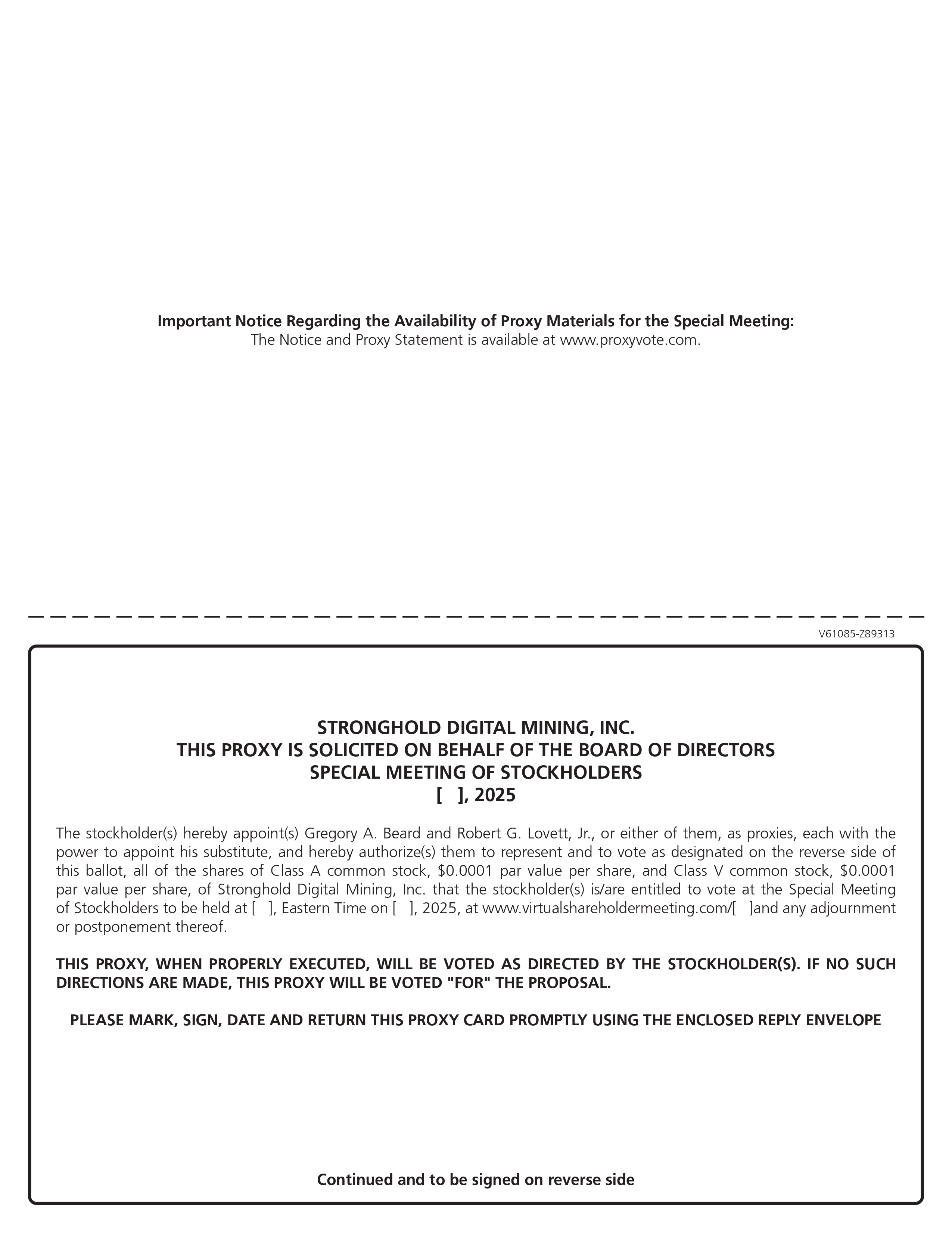 Important Notice Regarding the Availability of Proxy Materials for the Special Meeting: The Notice and Proxy Statement is available at www.proxyvote.com. V61085 - Z89313 STRONGHOLD DIGITAL MINING, INC. THIS PROXY IS SOLICITED ON BEHALF OF THE BOARD OF DIRECTORS SPECIAL MEETING OF STOCKHOLDERS [ ], 2025 The stockholder(s) hereby appoint(s) Gregory A . Beard and Robert G . Lovett, Jr . , or either of them, as proxies, each with the power to appoint his substitute, and hereby authorize(s) them to represent and to vote as designated on the reverse side of this ballot, all of the shares of Class A common stock, $ 0 . 0001 par value per share, and Class V common stock, $ 0 . 0001 par value per share, of Stronghold Digital Mining, Inc . that the stockholder(s) is/are entitled to vote at the Special Meeting of Stockholders to be held at [ ], Eastern Time on [ ], 2025 , at www . virtualshareholdermeeting . com/[ ]and any adjournment or postponement thereof . THIS PROXY, WHEN PROPERLY EXECUTED, WILL BE VOTED AS DIRECTED BY THE STOCKHOLDER(S) . IF NO SUCH DIRECTIONS ARE MADE, THIS PROXY WILL BE VOTED "FOR" THE PROPOSAL . PLEASE MARK, SIGN, DATE AND RETURN THIS PROXY CARD PROMPTLY USING THE ENCLOSED REPLY ENVELOPE Continued and to be signed on reverse side